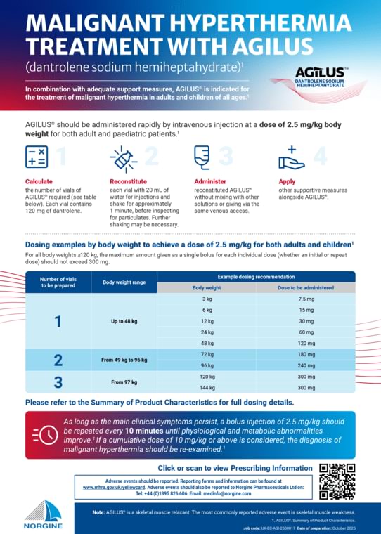 In combination with adequate support measures, AGILUS® (dantrolene sodium hemiheptahydrate) is indicated for the treatment of malignant hyperthermia in adults and children of all ages.